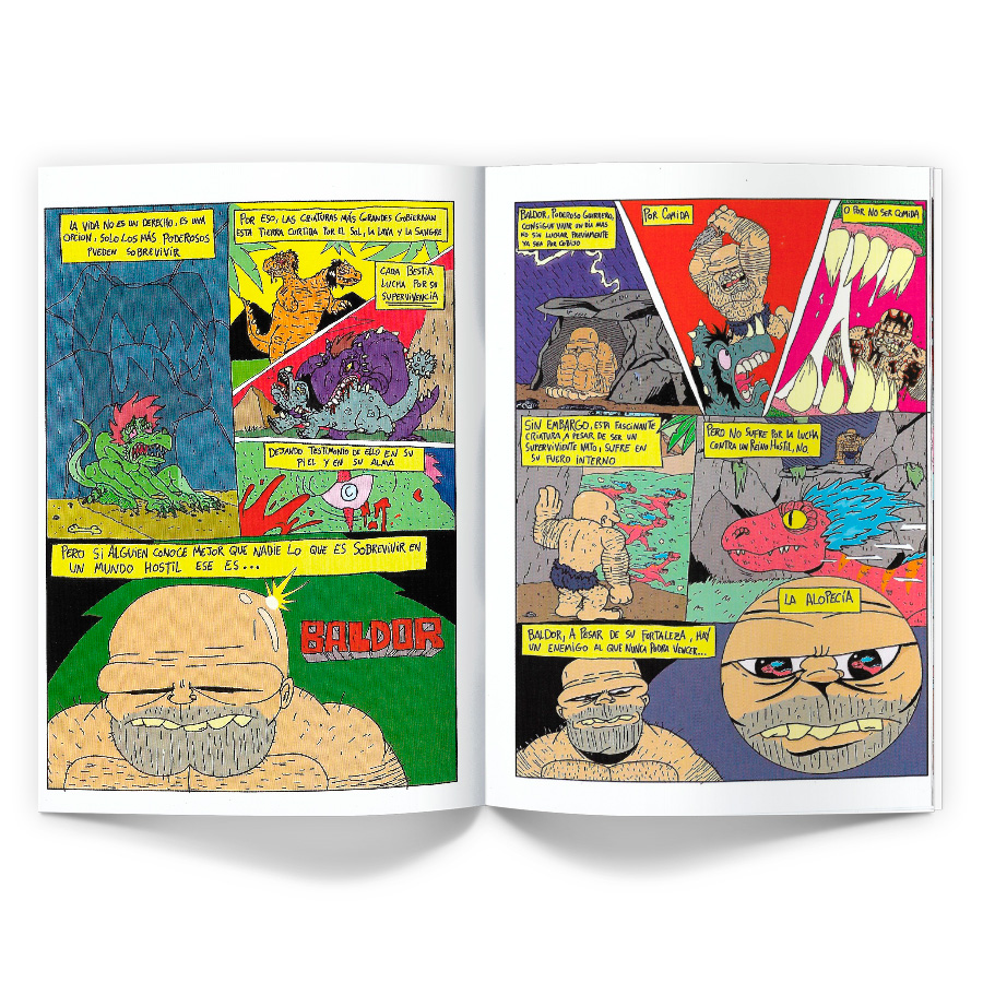 Cómic publicado en castellano, sigue las aventuras del primer hombre calvo frente al peligro de los melenudos Punkysaurios.