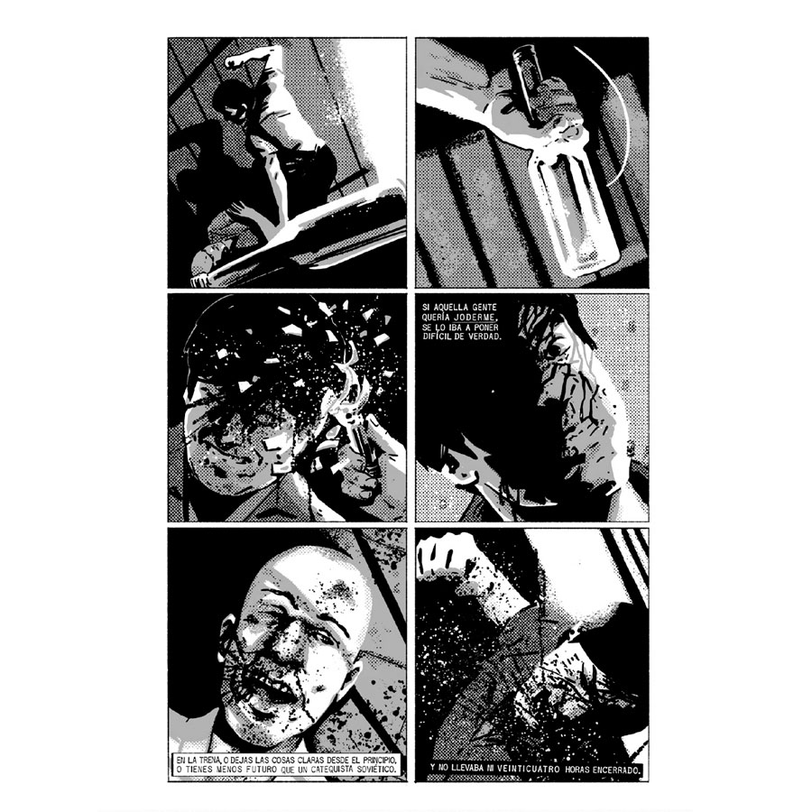 Javier Marquina y Jaime Infante toman como base el “Mear Sangre” de Dum Dum Pacheco –autobiografía que el boxeador comenzó a escribir en la cárcel a los 19 años cuando llevaba ya tres preso en Carabanchel– y algunos otros documentos y testimonios del boxeador, para construir este DUM DUM. Si el relato original de Pacheco ya es de una violencia bestial descarnada, ponerle imágenes a todo esto lo aterriza como la barbaridad escalofriante que es. Pacheco es criado a hostias, curtido por ese mismo sistema pedagógico, delincuencia y talego. Hostias abundantes para poder salir más o menos indemne de su paso por la cárcel. Y el carácter siempre presente, que no ayuda. La legión, el boxeo y la vida cotidiana, donde, totalmente interiorizada, tampoco puede faltar la violencia.