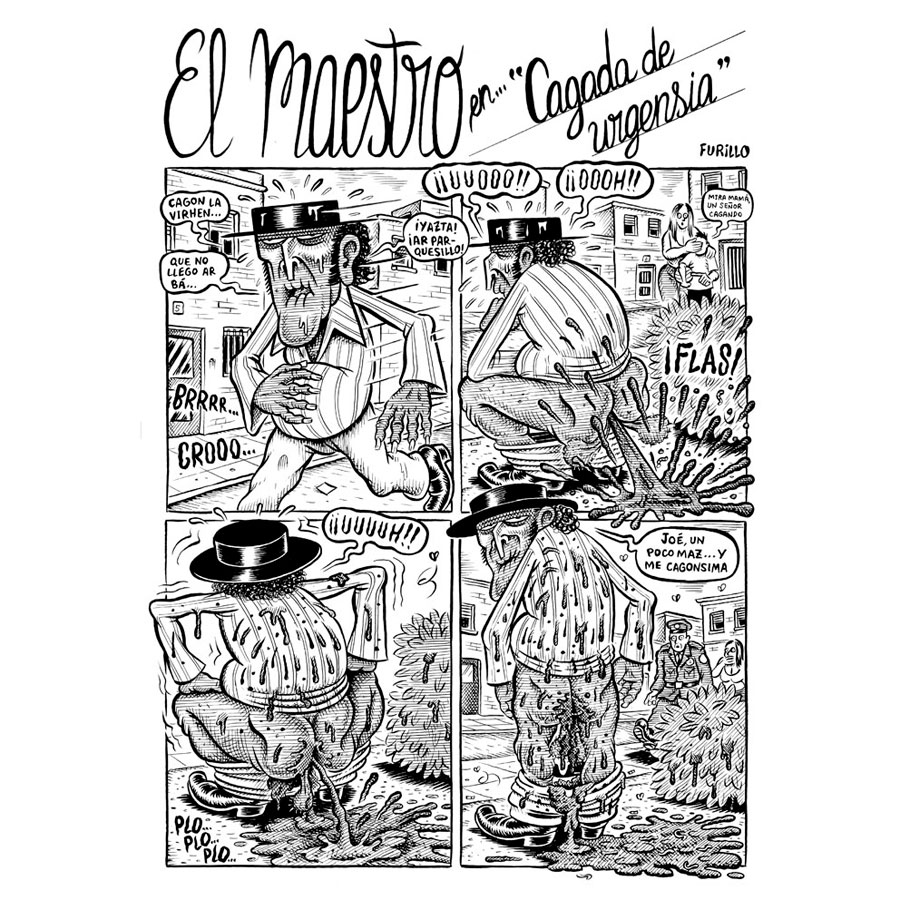 Por una vez voy a ir al grano –supurante–, para quienes no conozcan al protagonista de esta obra. El Maestro es un ex torero viejo, guarro y rancio, que frecuenta un bar viejo, guarro y rancio, una especie de Cheers a la española, con su propietaria atractiva, su camarilla de fijos con los que comparte momentos de concordia y confianza, amoríos de madurez, visitas al médico, excursiones a la playa… en fin, una sitcom pero en híper realista. Aquí nadie podrá reprochar falta de verosimiltud bajo el manido argumento de que los protagonistas nunca van al baño. “Au contraire, mon ami” aquí se jiña lo que no ha cagado Tintin en 90 años. Pelos escrotales, diarrea, larvas de parásitos humanos, costras purulentas… no sé qué añadir para seducirle y le den al botón de “echar al carro”.